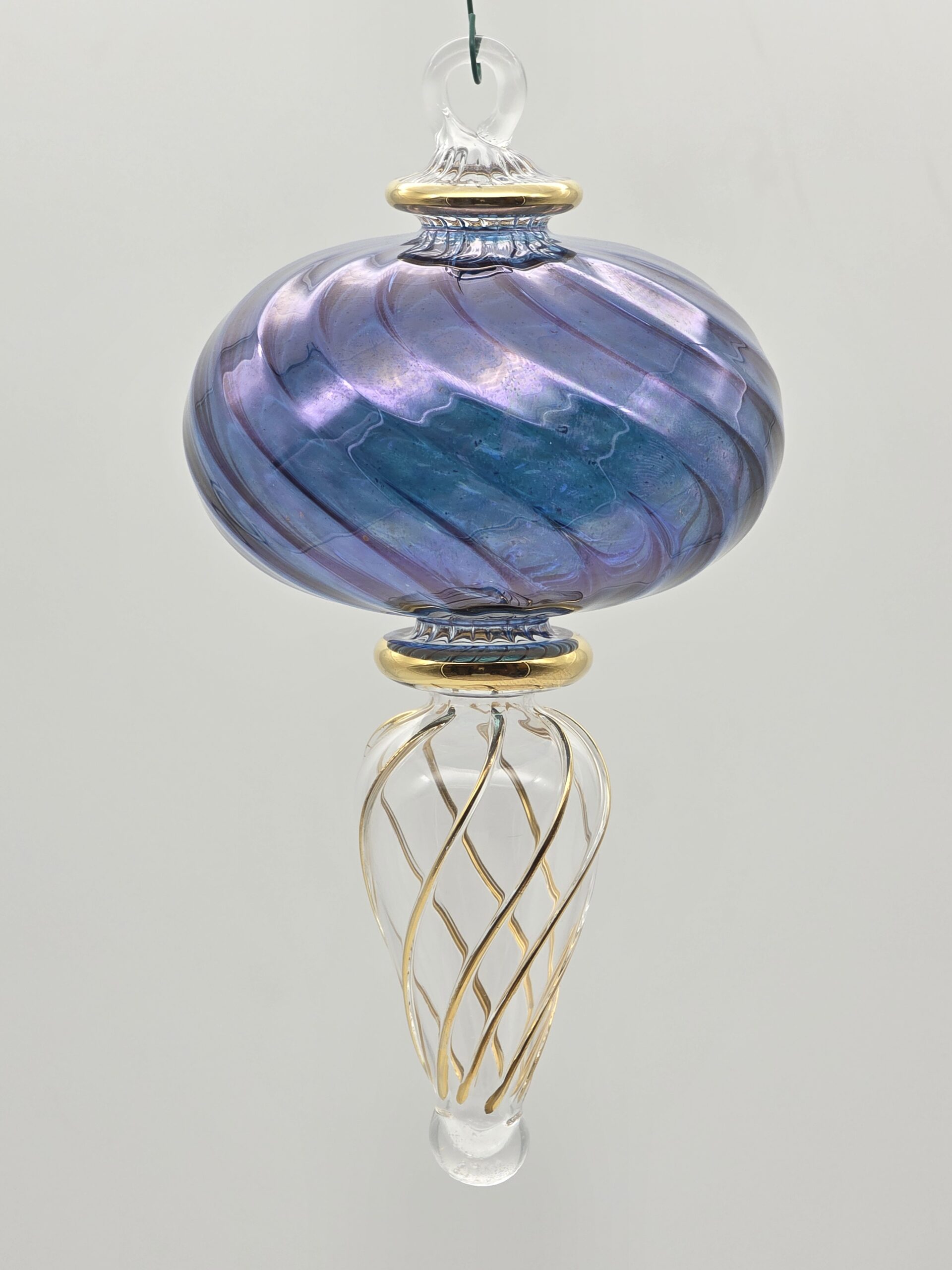 El Adorno Cielo Egipcio es un adorno de cristal soplado, totalmente artesanal. Fabricado y pintado a mano en Egipto y presenta un diseño de remolino azul en la parte superior y una base transparente con detalles dorados.