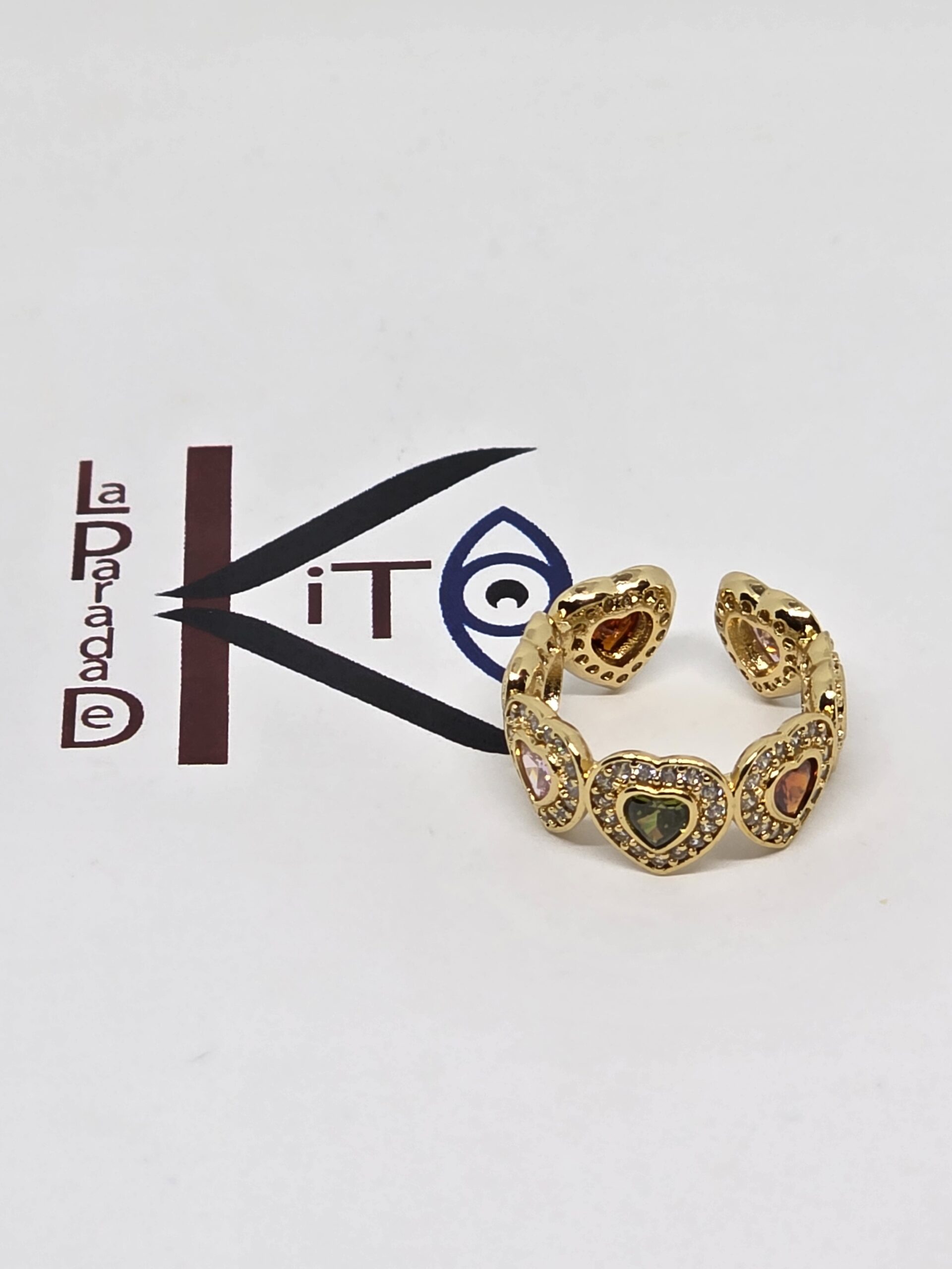 El Anillo Fantasía Corazón es pura fantasía, un accesorio elegante y resistente, elaborado en acero dorado antialérgico y decorado con corazones de circonita de diferentes colores, como rosa, verde, marrón…