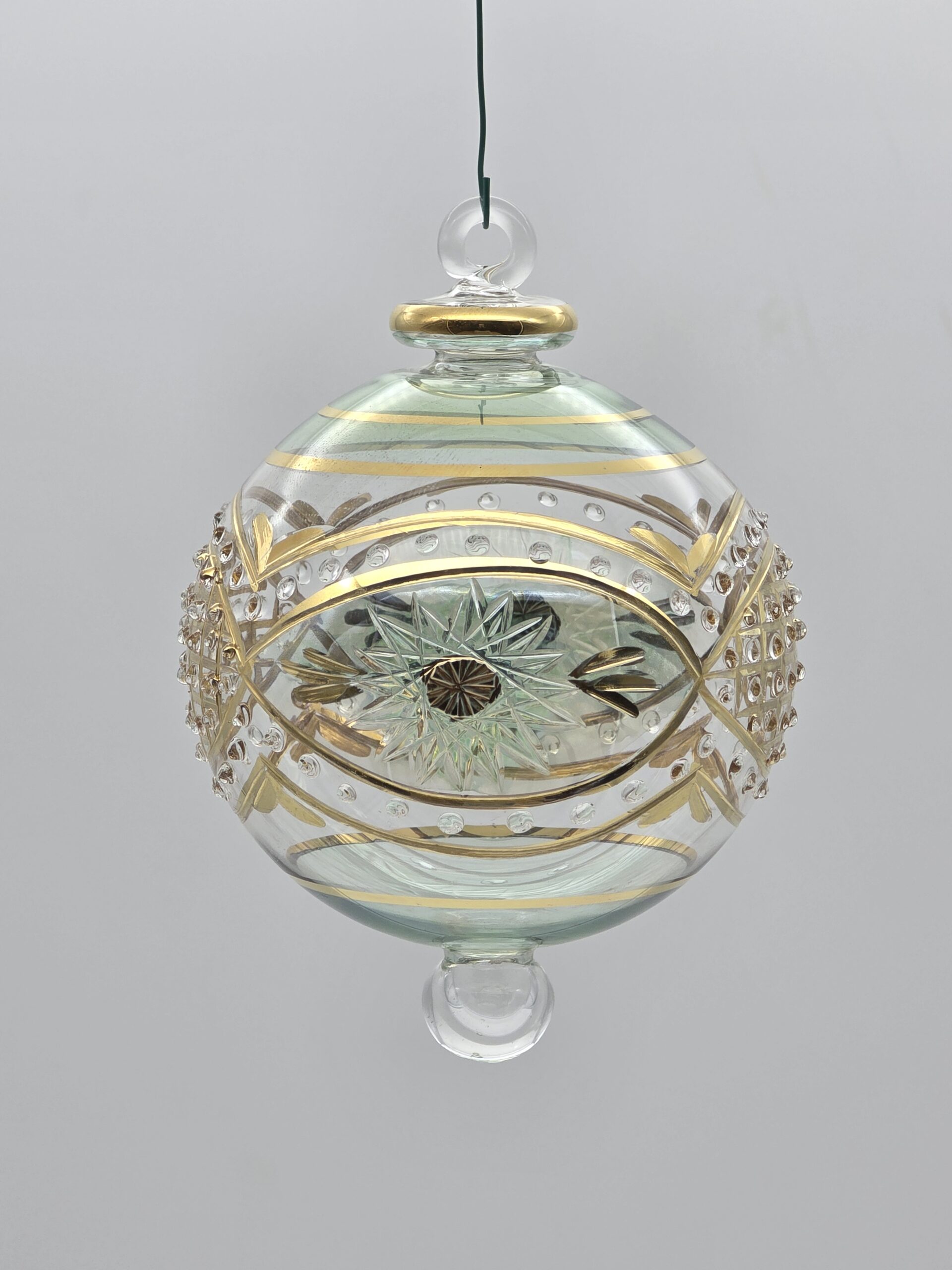 La Esfera Belleza Faraónica de cristal soplado, fabricada y pintada a mano, presenta una flor tallada con cuentas de vidrio en tonos dorados, simbolizando la belleza y exquisitez faraónica.