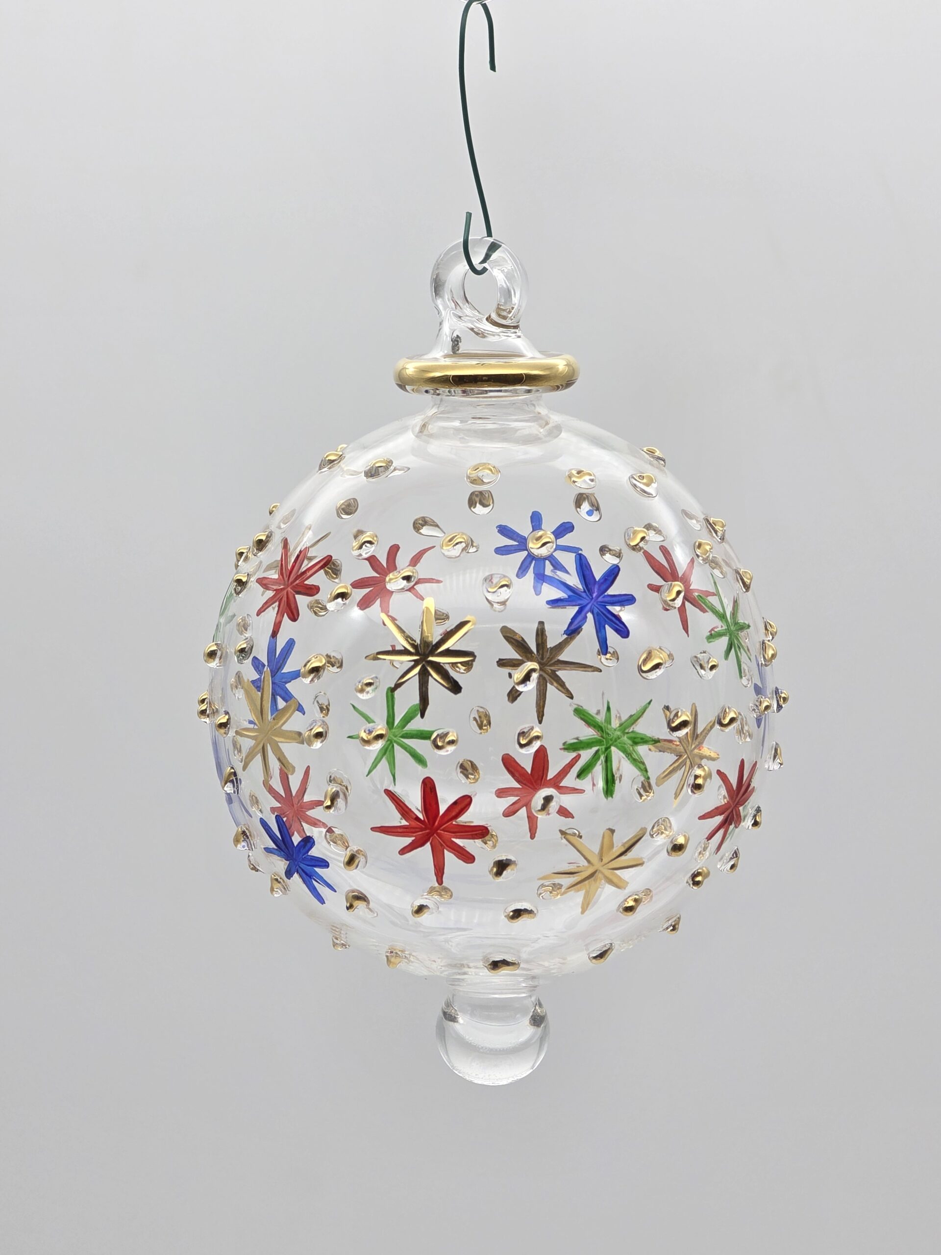 La Esfera Estrellas Navidad está elaborada en cristal soplado, fabricada y pintada a mano, presenta un diseño de estrellas navideñas de muchos colores y detalles dorados.