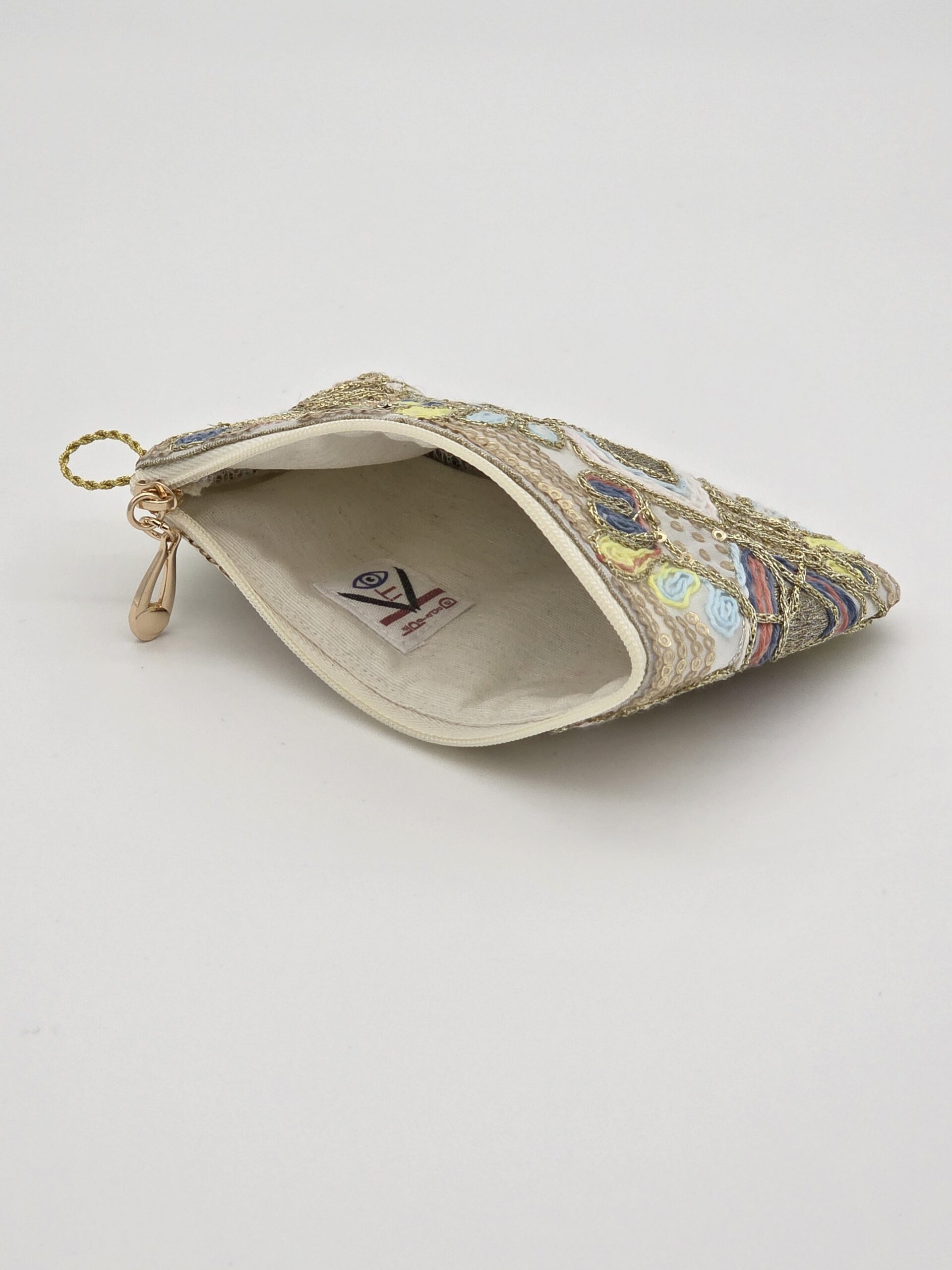 El Monedero Artesanal Maravilla destaca por su elegante diseño moderno y chic. Su precioso tejido mezcla diferentes hilos de colores, dibujando formas variadas, con lentejuelas doradas, sobre un fondo blanco. Es un complemento exclusivo y cuenta con cremallera metálica con un bonito cierre dorado. También presenta una práctica cinta dorada lateral.