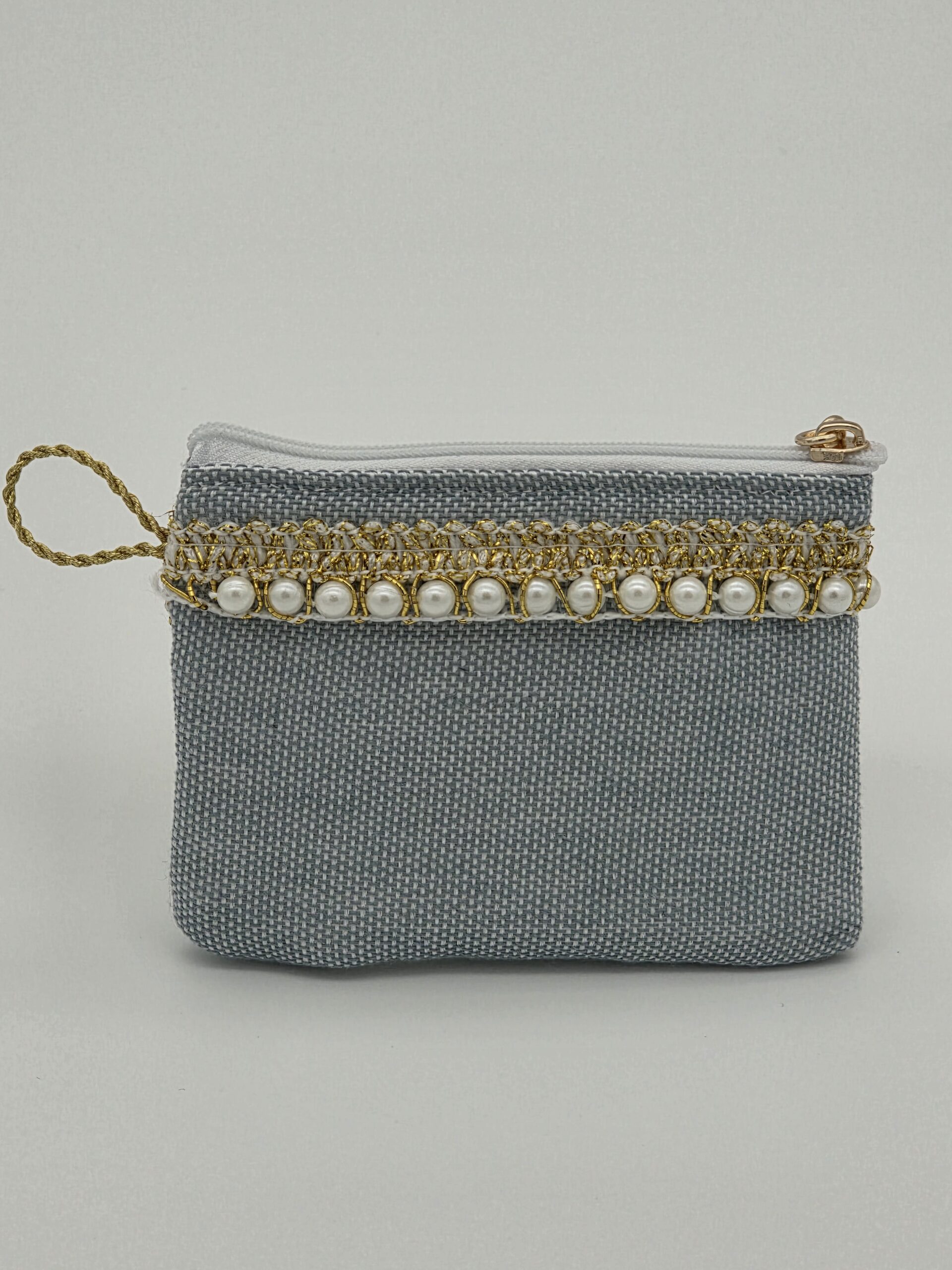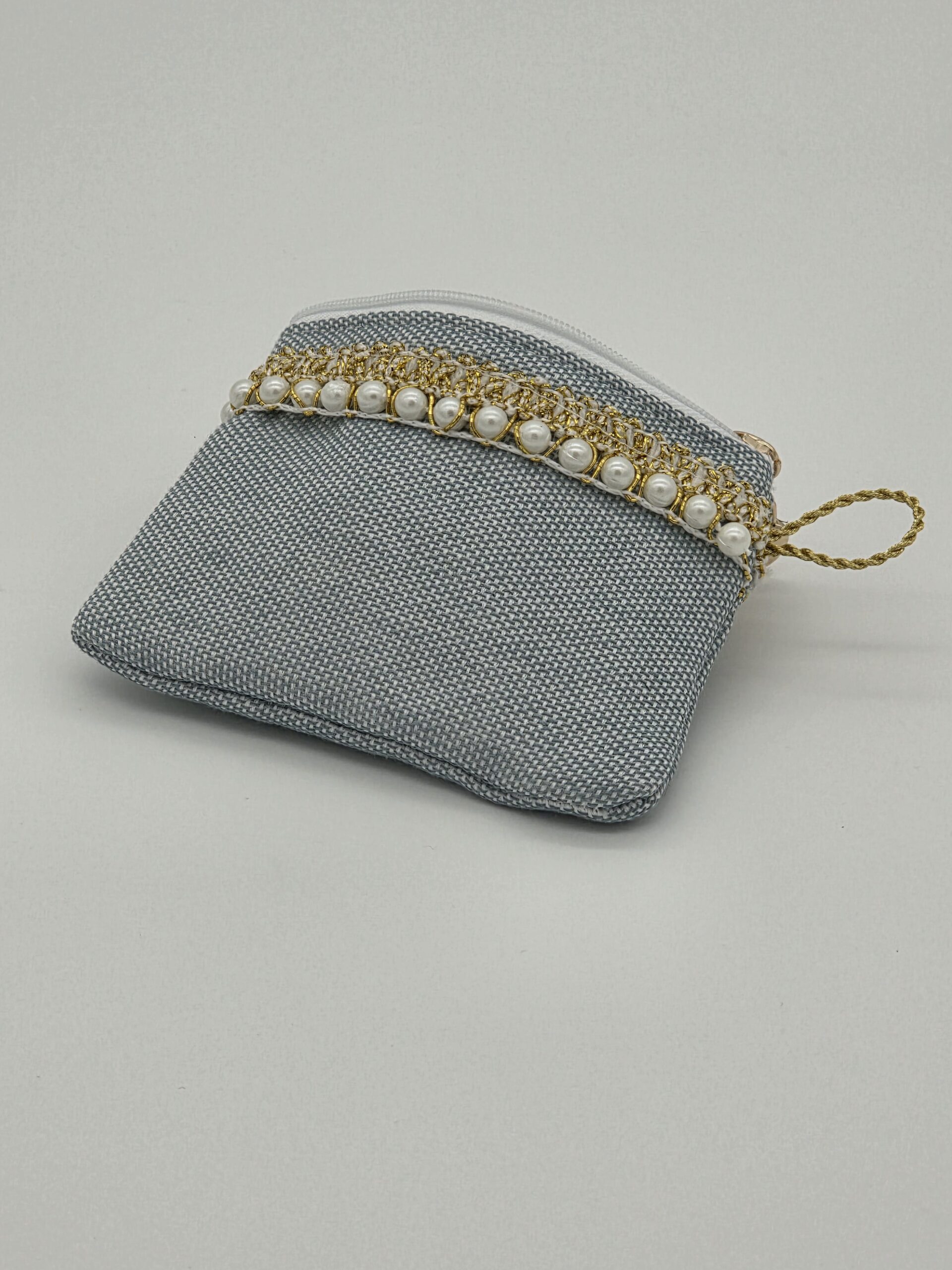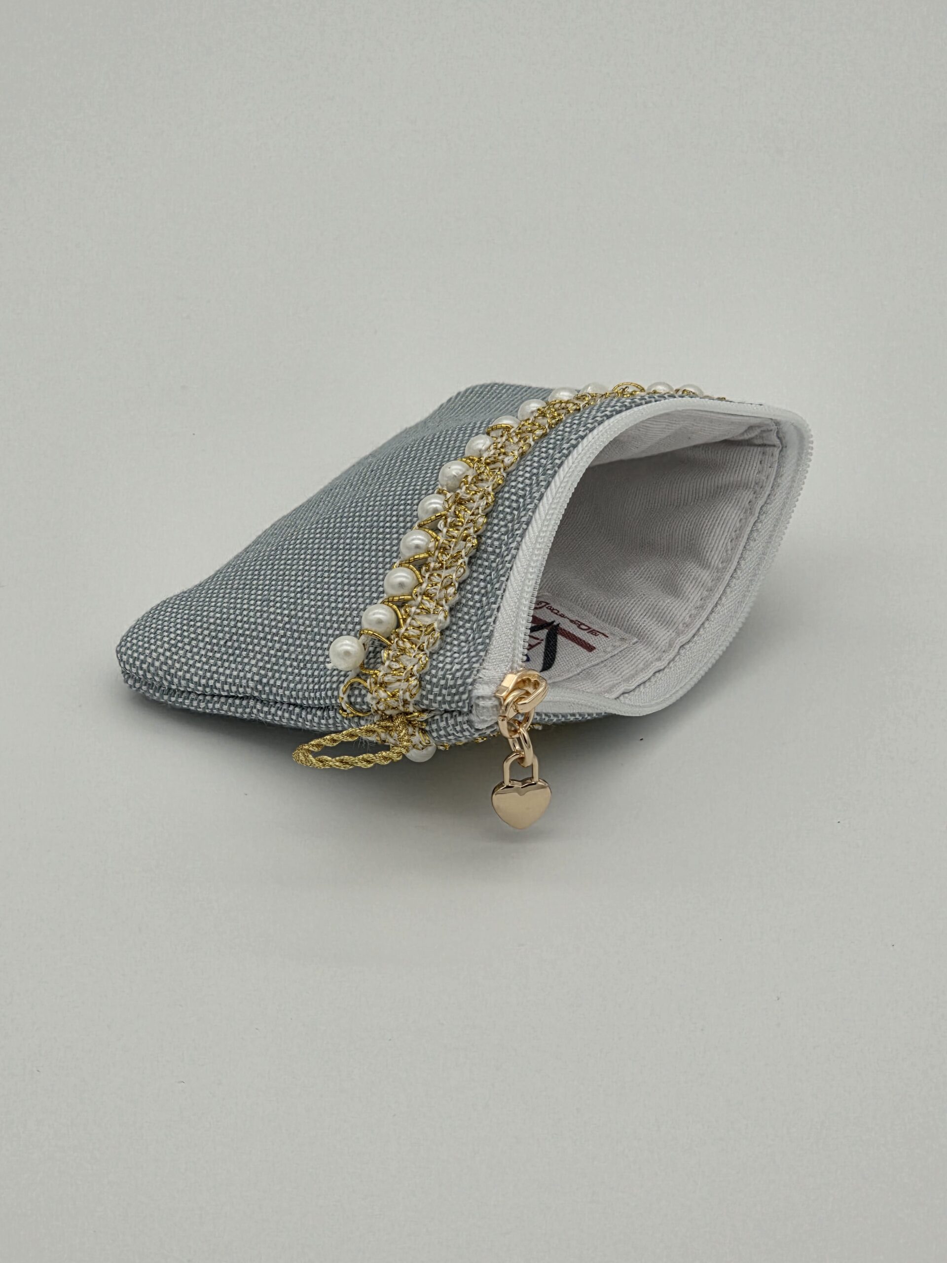 Este monedero artesanal hecho a mano destaca por su bonito diseño en color celeste cálido, adornado con pasamanería de perlas blancas. El tejido es suave y aporta personalidad y carácter a este complemento exclusivo. Cuenta con cremallera metálica y colgante en forma de corazón dorado, También cuenta con una práctica cinta dorada lateral.
