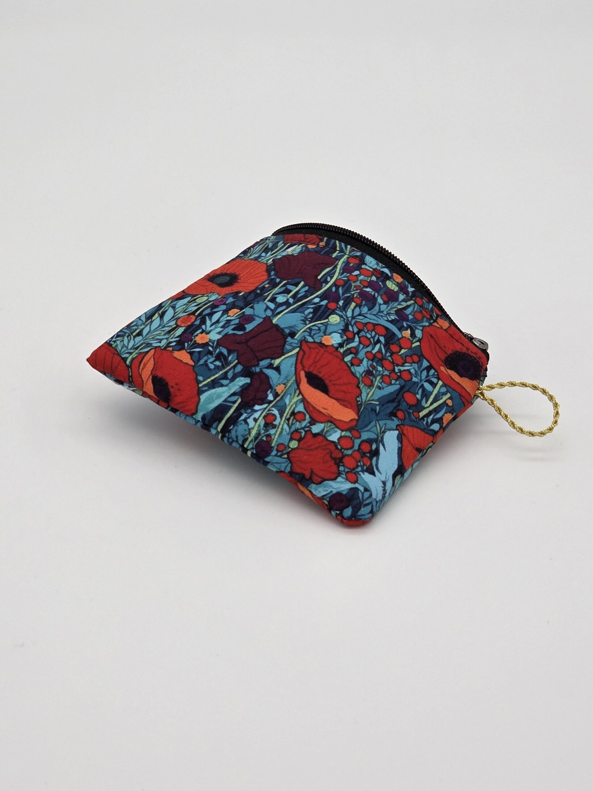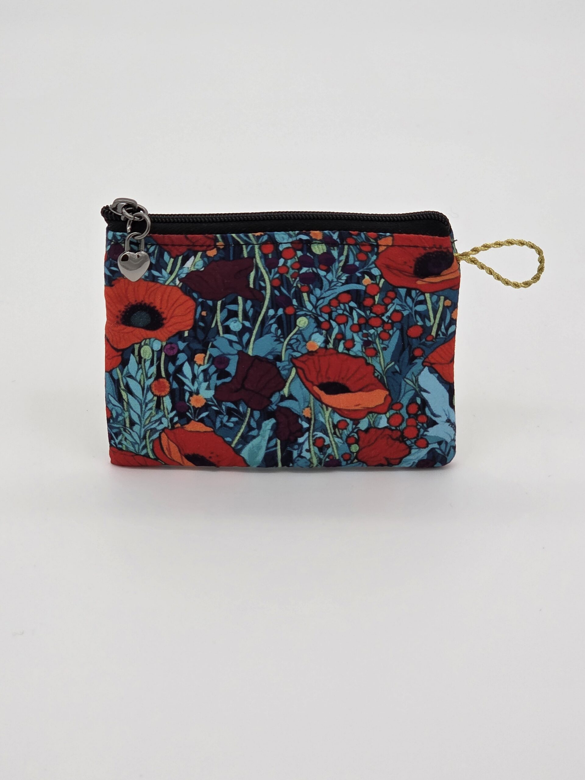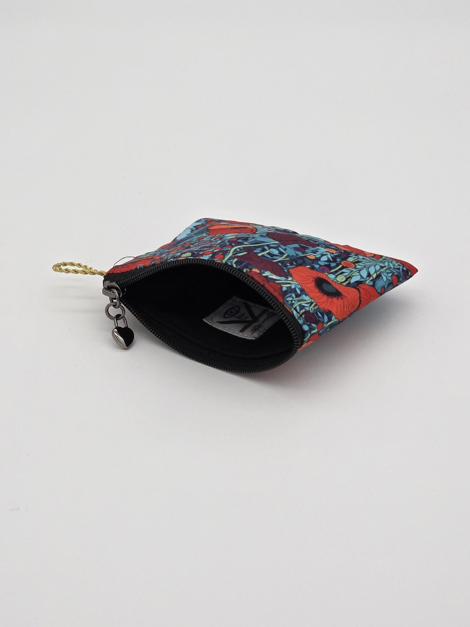 El Monedero Fantasía Amapolas es un monedero artesanal que destaca por su bonitos colores mezclando el rojo intenso de la amapola, sobre fondos de azules en diferentes tonos. El tejido tiene un tacto muy agradable y aporta personalidad y carácter a este complemento exclusivo. Cuenta con cremallera metálica y colgante en forma de corazón negro, También cuenta con una práctica cinta dorada lateral.