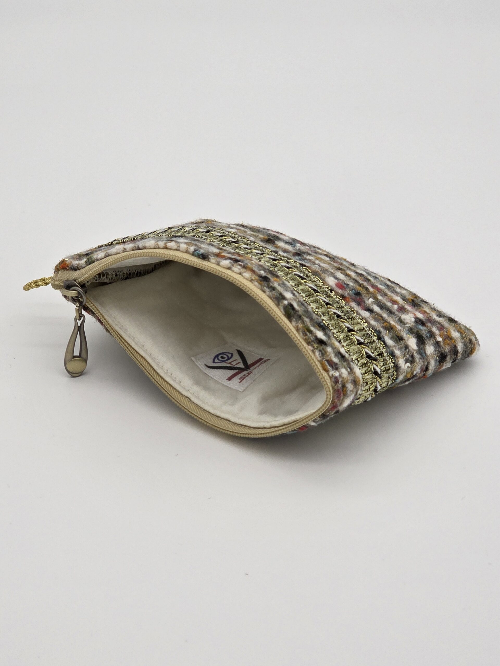 El Monedero Fantasía Ideal destaca por su elegante diseño atemporal, y a la vez moderno y chic. El tejido es de lanita, con una bonita mezcla colores y brillos, adornado con pasamanería dorada. Es un complemento exclusivo y cuenta con cremallera metálica y rematada en un bonito colgante. También presenta una práctica cinta dorada lateral.