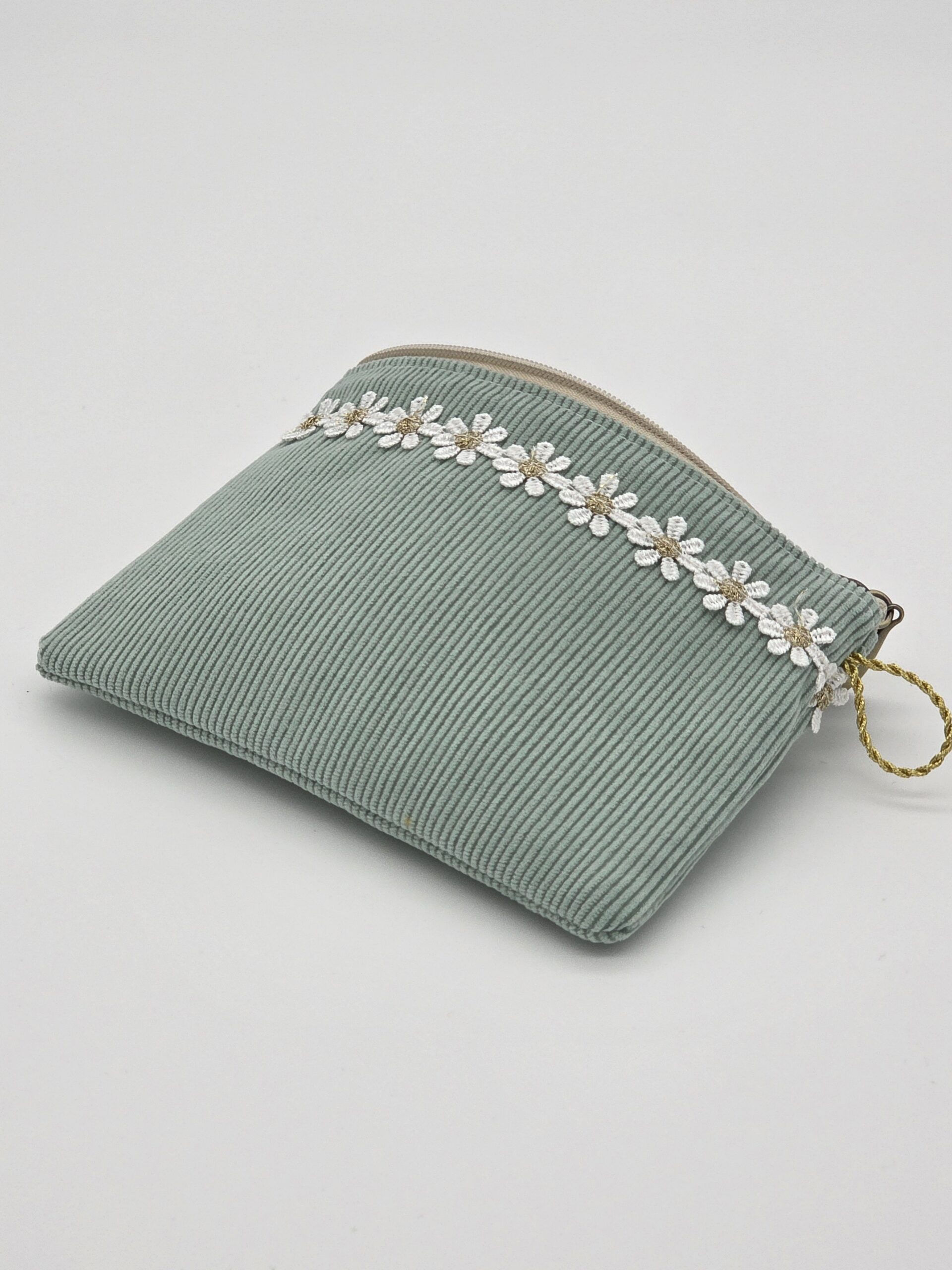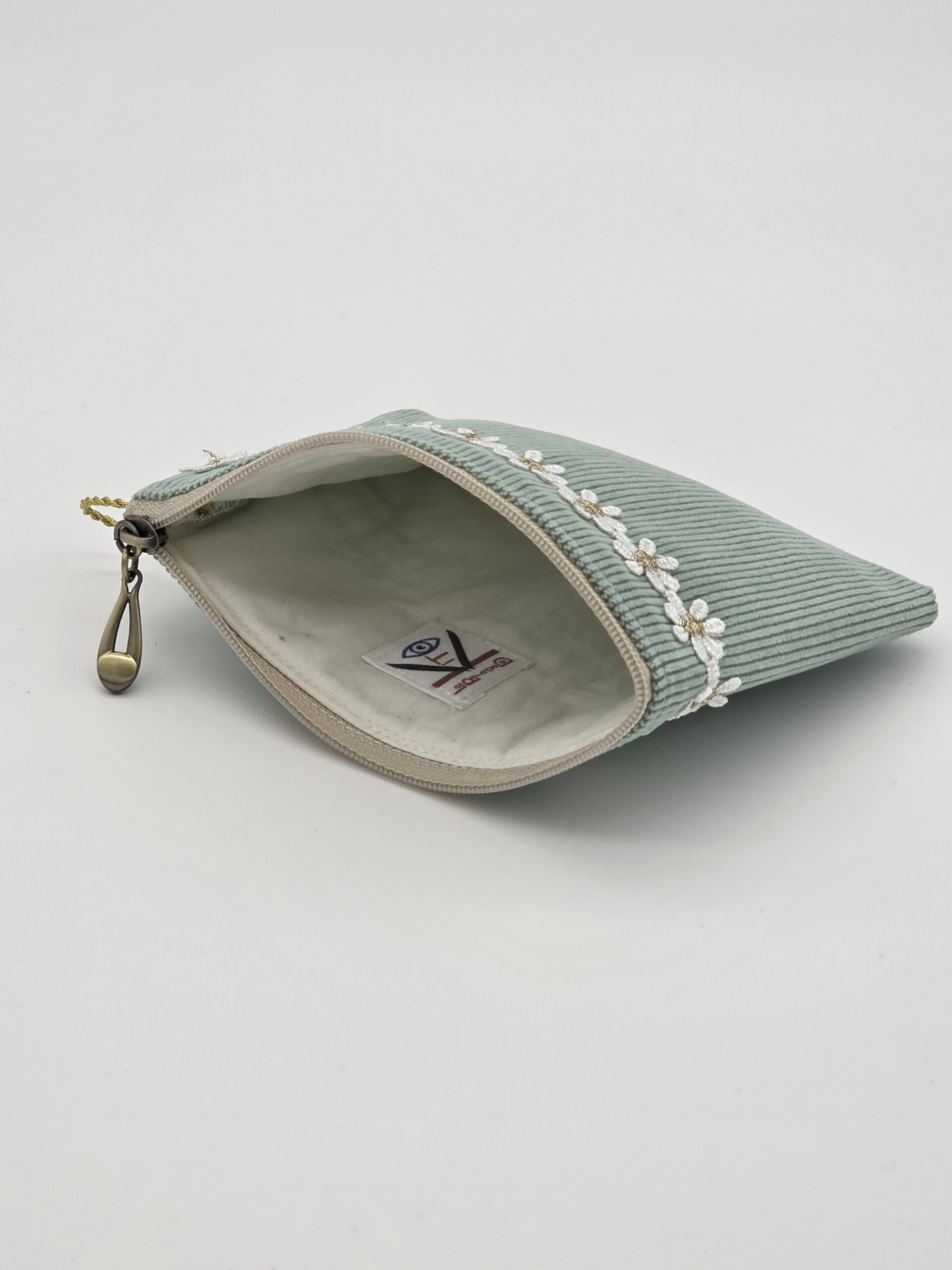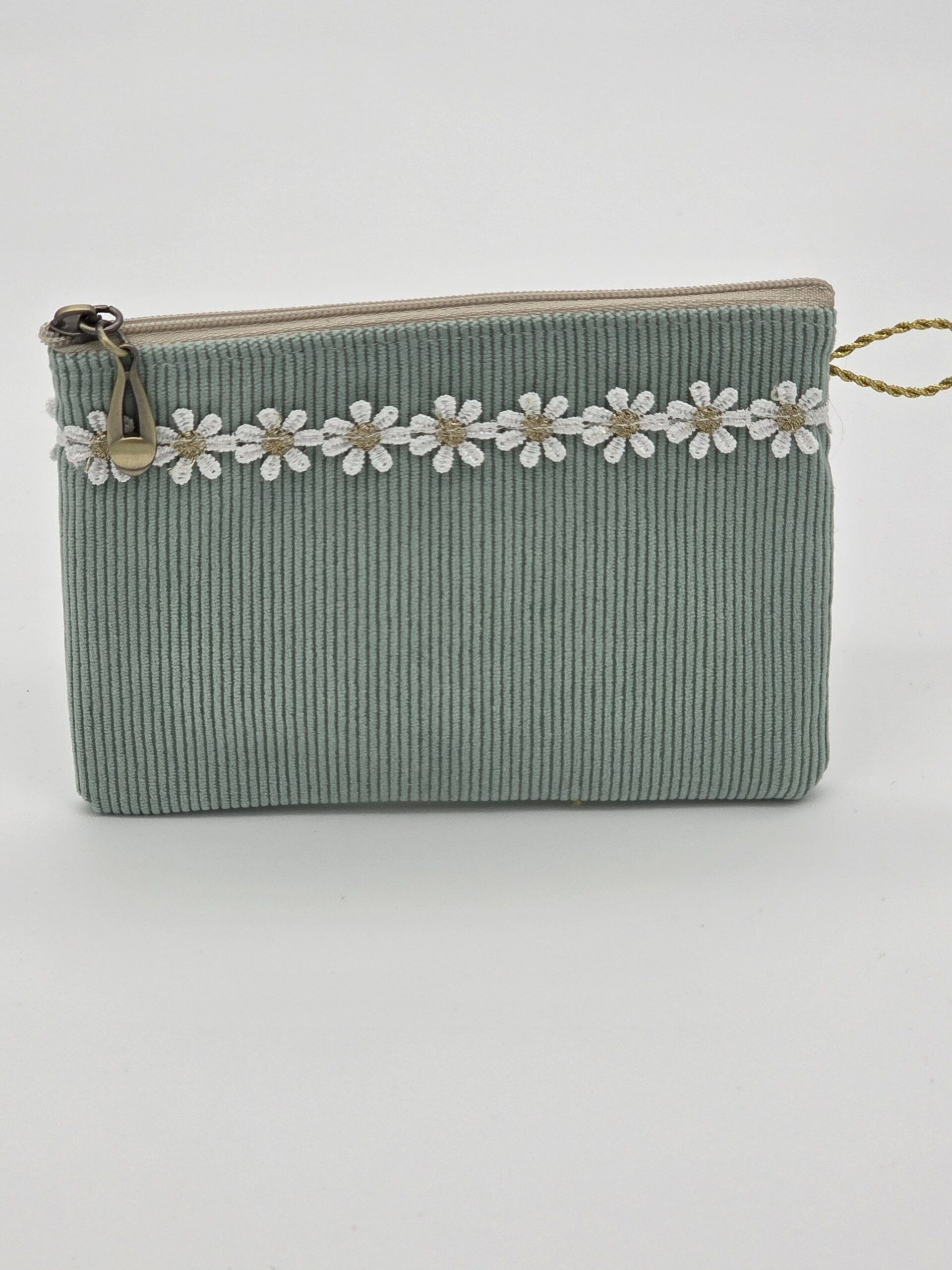 El Monedero Fantasía Pana destaca por su elegante diseño atemporal, y a la vez moderno y chic. El tejido es de pana fina de color celeste, adornado con margaritas blancas con el centro dorado. Es un complemento exclusivo y cuenta con cremallera metálica y rematada en un bonito colgante. También presenta una práctica cinta dorada lateral.