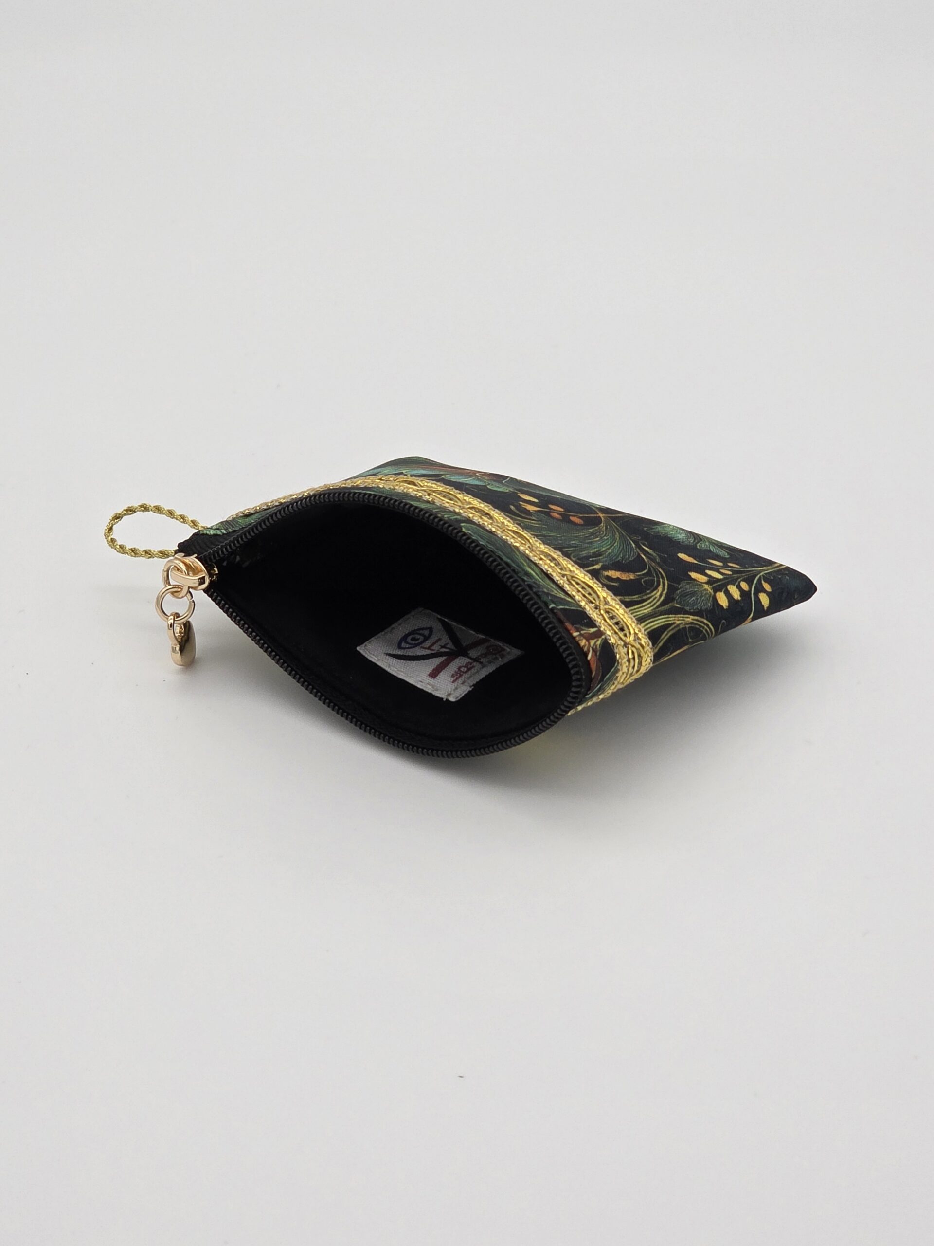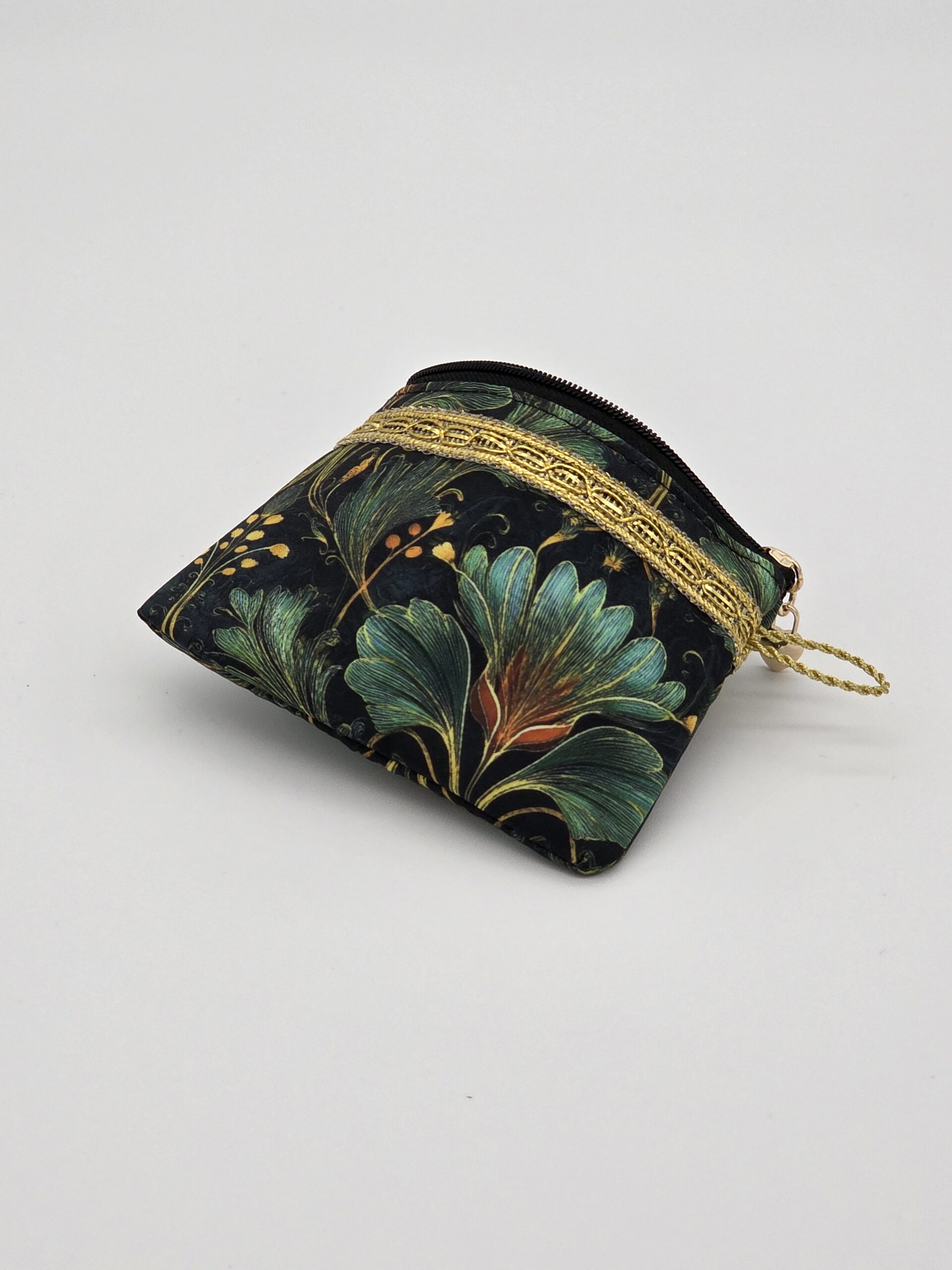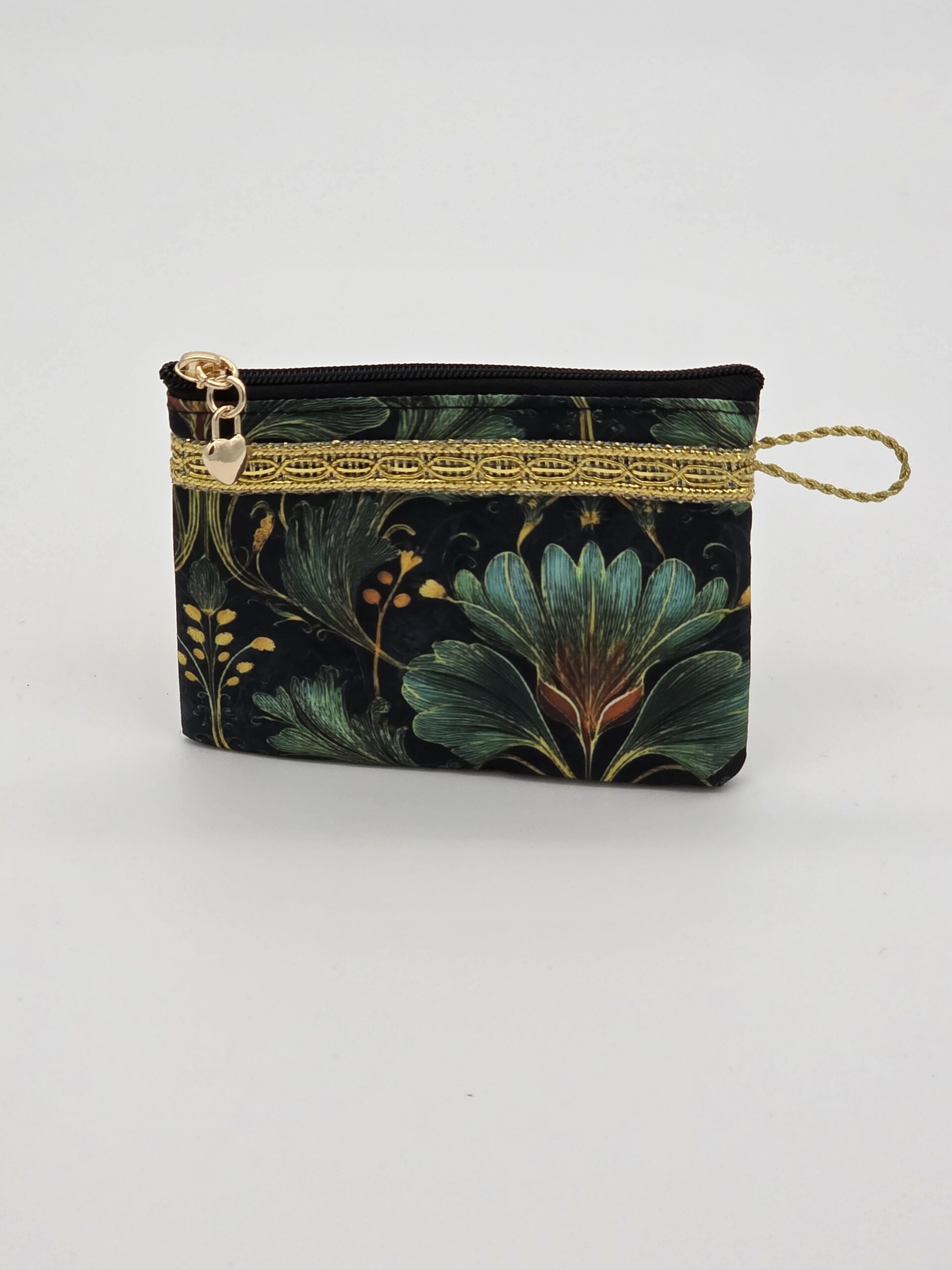 El Monedero Sueño Floral es un monedero artesanal que destaca por su bonitos colores, mezclando flores de diferentes tonos verdes sobre un fondo oscuro, adornado con una bonita cinta dorada. El tejido tiene un tacto muy agradable y aporta personalidad y carácter a este complemento exclusivo. Cuenta con cremallera metálica y colgante en forma de corazón dorado. También cuenta con una práctica cinta dorada lateral.